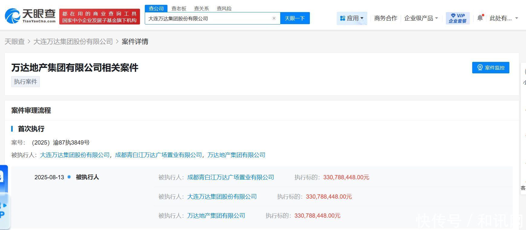天眼查App显示深圳股票配资公司,近日,大连万达集团股份有限公司、万达地产集团有限公司、成都青白江万达广场置业有限公司新增一则被执行人信息,执行标的3.3亿余元。